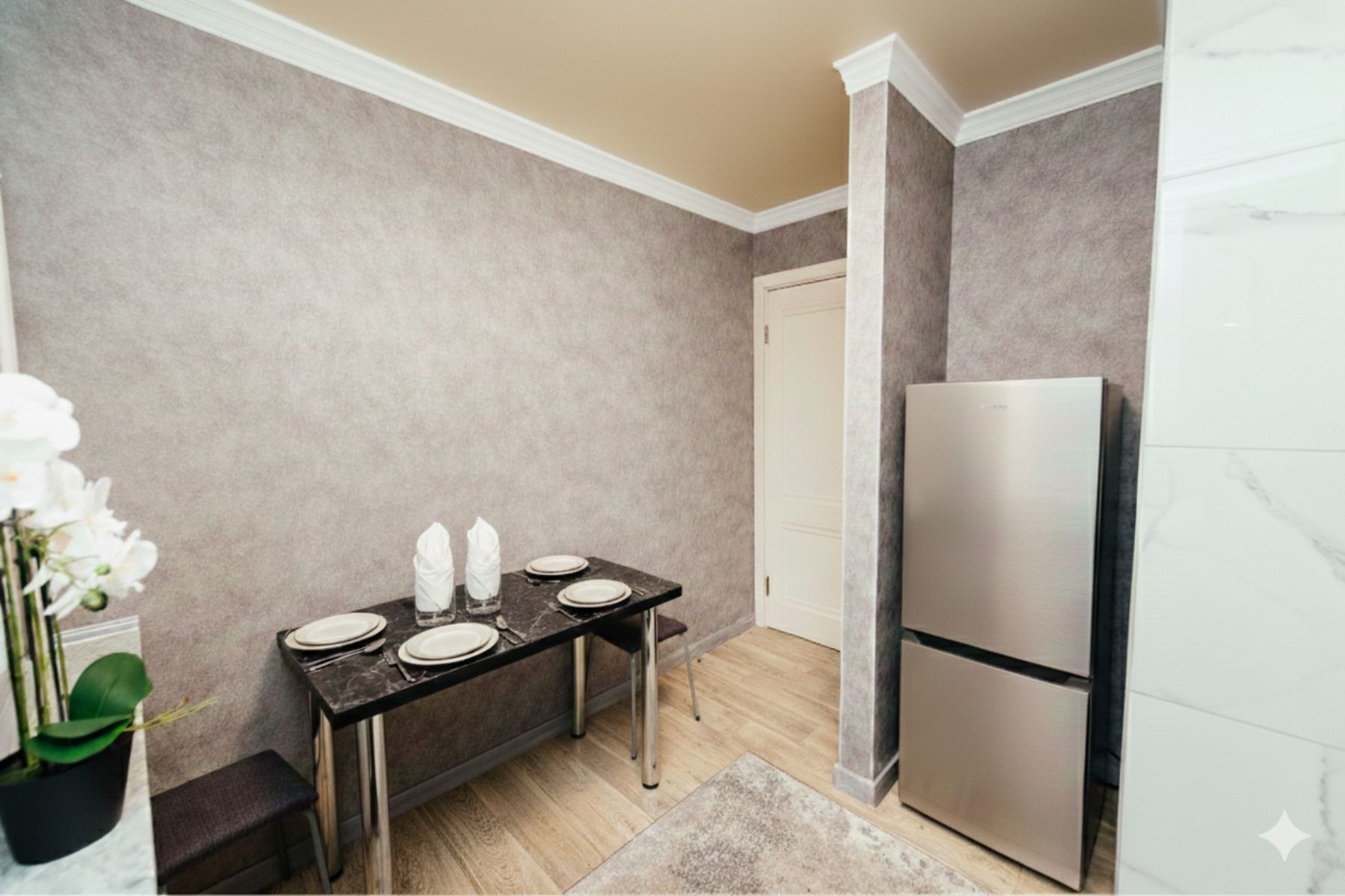 Bucătărie: Set complet de electrocasnice — frigider, cuptor cu microunde, plită și toată vesela necesară pentru gătit.